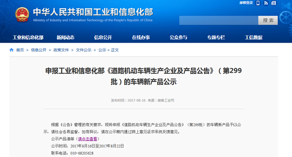中國(guó)儲(chǔ)能網(wǎng)訊:8月16日,國(guó)家工信部公示了申報(bào)《道路機(jī)動(dòng)車輛生產(chǎn)企業(yè)及產(chǎn)品公告》(第299批)的車輛新產(chǎn)品名單,公示日期為2017年8月16日至2017年8月22日。