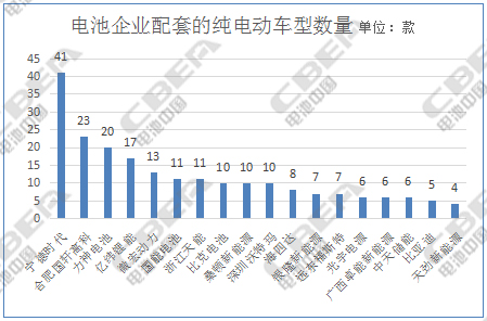 動(dòng)力電池企業(yè)搭載的純電動(dòng)車型數(shù)量懸殊較大,寧德時(shí)代電池產(chǎn)品搭載的純電動(dòng)車型最多,高達(dá)41款;合肥國(guó)軒高科(23款)、力神電池(20款)、億緯鋰能(17款)、微宏動(dòng)力(13款)、國(guó)能電池(11款)、浙江天能電池(11款)、比克電池(10款)、桑頓新能源(10款)等搭載的車型也較多;而有些電池企業(yè)配套車型僅有1款。