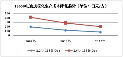 圖2 規(guī)?;a(chǎn)電池價(jià)格降低趨勢(shì)(以18650電池為例)