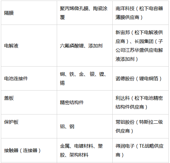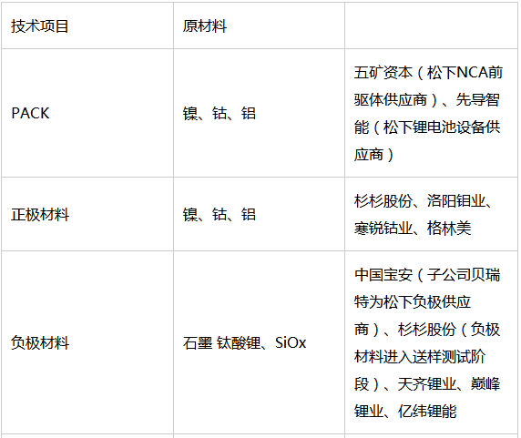 鋰電池組電池PACK也就是鋰電池制造商為日本松下Panasonic公司,其中,五礦資本為松下提供前驅(qū)體,而先導(dǎo)智能為松下提供鋰電池制造設(shè)備;松下產(chǎn)電池正極材料供應(yīng)商為住友金屬Sumitomo,而鎳、鈷、鋁等原材料供應(yīng)商則是來自中國的杉杉股份、洛陽鉬業(yè)、寒銳鈷業(yè)和格林美三家企業(yè);負(fù)極材料的供應(yīng)商為日本日立化學(xué)HITACHI,石墨來自于中國寶安下屬子公司貝特瑞,鈦酸鋰、SiOx 則來自天齊鋰業(yè)、巔峰鋰業(yè)、億緯鋰能,杉杉股份負(fù)極材料進(jìn)入送樣測試階段;隔膜來自日本住友化學(xué)Sumitomo,原材料聚丙烯微孔膜、陶瓷涂覆供應(yīng)商是中國南洋科技,這家公司同時(shí)也是松下電容器薄膜供應(yīng)商;電解液是日本三菱化學(xué)生產(chǎn),其溶質(zhì)六氟磷酸鋰來自中國的新宙邦,它同時(shí)也是松下電解液的供應(yīng)商,添加劑來自于長園集團(tuán)子公司江蘇華盛;電池連接件由中國參股科倫特的長盈精密公司提供;蓋板、保護(hù)殼由中國旭升股份提供,而其背后精密結(jié)構(gòu)件由松下電池精密結(jié)構(gòu)件供應(yīng)商利達(dá)科提供,鋁、鋼由常鋁股份提供。