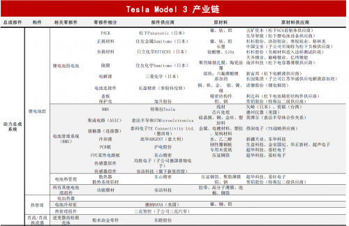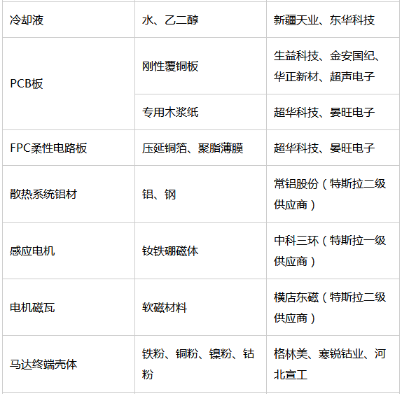 在電驅(qū)系統(tǒng)中,電機(jī)感應(yīng)電原材料釹鐵硼磁體由中國特斯拉一級(jí)供應(yīng)商中科三環(huán);銅轉(zhuǎn)子由中國公司質(zhì)信電機(jī)提供;電機(jī)磁瓦軟磁材料由特斯拉二級(jí)供應(yīng)商橫店東磁提供;馬達(dá)終端殼體粉末冶金零件由中國公司東睦股份制造,原材料鐵粉、銅粉、鎳粉、鈷粉來自于格林美、寒銳鈷業(yè)和河北宣工;單機(jī)驅(qū)動(dòng)模塊微型變速箱變速箱箱體由旭升股份提供。