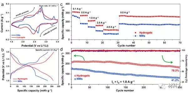 圖四 H2V3O8水凝膠和納米線的電化學(xué)性能表征