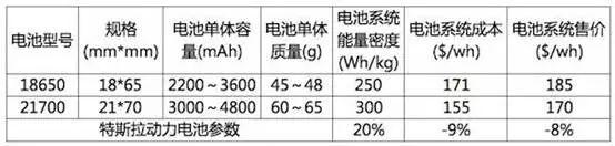 根據(jù)特斯拉披露的信息,在現(xiàn)有條件下,特斯拉生產(chǎn)的21700電池單體比能量達到了300wh/kg,比原來的18650電池能量密度提升20%以上、單體容量提升35%、系統(tǒng)成本降低9%達到155美元/Wh、在同等能量下所需電池數(shù)量可減少約1/3,系統(tǒng)重量減輕了10%。