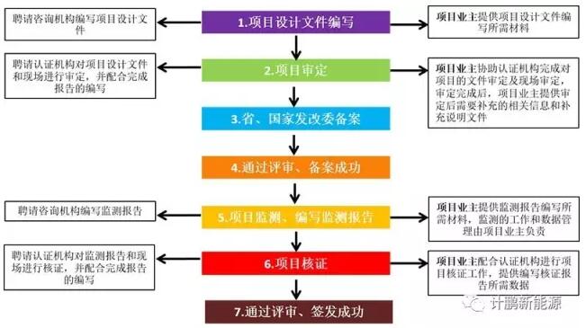 由于CCER項(xiàng)目申請(qǐng)需要準(zhǔn)備的資料較多,部分類型項(xiàng)目的專業(yè)性較強(qiáng),大部分項(xiàng)目業(yè)主不具備自主開發(fā)CCER項(xiàng)目的能力和人力,因此現(xiàn)在大多項(xiàng)目業(yè)主會(huì)聘請(qǐng)專業(yè)的咨詢機(jī)構(gòu),開發(fā)審定與核證項(xiàng)目。另外,業(yè)主還需聘請(qǐng)第三方審核機(jī)構(gòu),對(duì)項(xiàng)目申請(qǐng)材料進(jìn)行審核,通過第三方審核的項(xiàng)目才可以報(bào)送發(fā)改委進(jìn)行備案。一般開發(fā)流程如下圖所示: