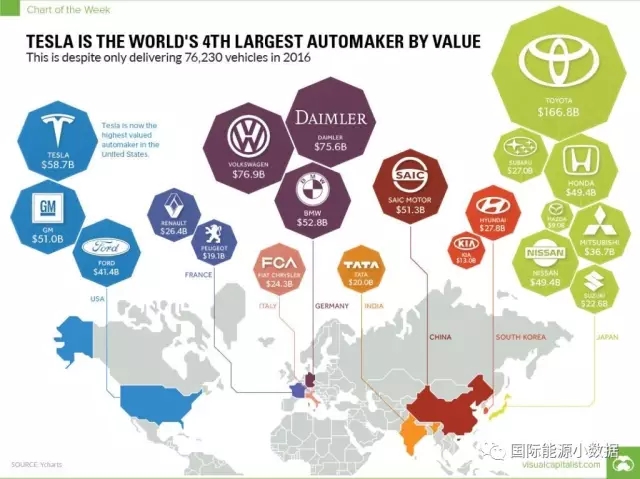 在全球范圍內(nèi)看,特斯拉已經(jīng)進入前4強,僅次于豐田(1668億美元)、戴姆勒(756億美元)、大眾(769億美元)。