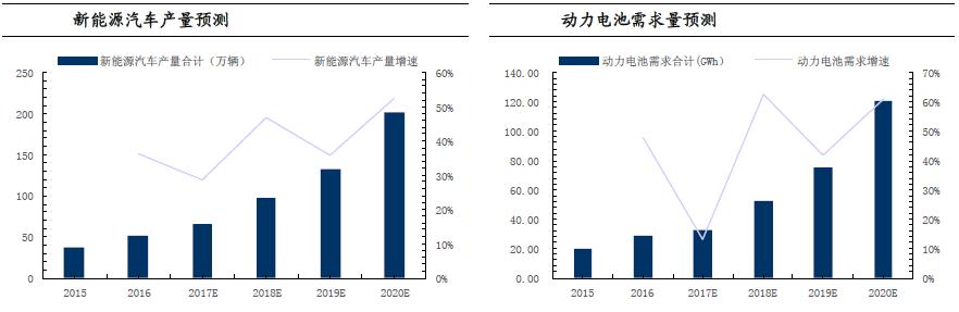 中商產(chǎn)業(yè)研究院發(fā)布報(bào)告顯示,預(yù)計(jì)2017年國內(nèi)新能源汽車總產(chǎn)量有望達(dá)到66.1萬輛,對(duì)應(yīng)動(dòng)力電池需求量達(dá)到32.5GWh,2020年國內(nèi)新能源汽車總產(chǎn)量有望到達(dá)200萬輛,對(duì)應(yīng)動(dòng)力電池需求達(dá)到120.8GWh。預(yù)計(jì)2017-2020年新能源汽車年均復(fù)合增速約為44.6%,動(dòng)力電池需求年均復(fù)合增速約為54.9%,考慮到動(dòng)力電池成本下降的市場空間年均復(fù)合增速約為36.8%。