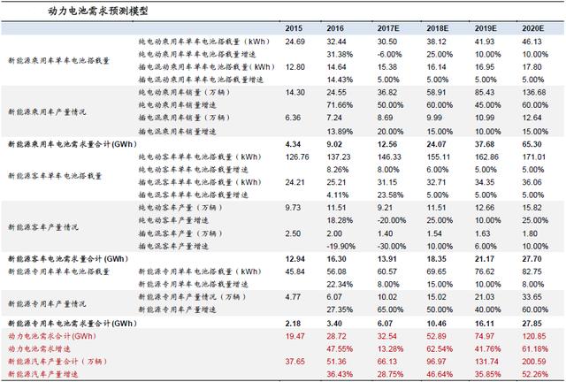 一般而言整車企業(yè)銷售的某款車型在未進(jìn)入補(bǔ)貼目錄時(shí)無法完全定價(jià),尤其是2016年補(bǔ)貼目錄全部重新調(diào)整,因此我們?cè)陬A(yù)測銷量增速時(shí)重點(diǎn)參考了2017年各車型進(jìn)入補(bǔ)貼目錄的進(jìn)度,其中客車環(huán)節(jié)下滑顯著,而專用車環(huán)節(jié)車型數(shù)量顯著增加。此外,我們也基于2017年達(dá)到70萬年銷量與2020年達(dá)到200萬年銷量的政策指引,因此我們假設(shè)純電動(dòng)客車今年下滑20%,插電混動(dòng)客車下滑30%,純電動(dòng)專用車增長65%,純電動(dòng)乘用車增長50%,插電乘用車增長20%。此外,由于2018年補(bǔ)貼不退坡,同時(shí)產(chǎn)業(yè)鏈第一次大幅降低成本到位,而17年基數(shù)相對(duì)低,預(yù)計(jì)2018年增速有所上升;2019年補(bǔ)貼再次退坡,并且18年提前透支部分消費(fèi),19年產(chǎn)銷增速同比18年略微放緩,而2020年補(bǔ)貼不退坡,也是新能源銷量目標(biāo)政策沖刺最后一年,我們預(yù)計(jì)產(chǎn)銷增速有望提速。