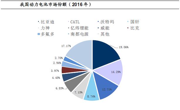 動(dòng)力電池產(chǎn)能主要集中在中日韓三國,行業(yè)巨頭主要包括韓國的松下、三星、LG化學(xué)以及日本的ASEC、三洋電氣、日本湯淺以及SK集團(tuán)等。國內(nèi)層面,2016年全國動(dòng)力電池出貨量達(dá)到30.5GWh,比亞迪屬于行業(yè)龍頭,全國市占率達(dá)到19.06%,其次為CATL與沃特瑪,市場份額分別為14.29%與12.71%。我們認(rèn)為目前動(dòng)力電池行業(yè)集中度相對(duì)較高,CR10達(dá)到82.83%,CR4達(dá)到54.8%,雖然行業(yè)處于急速擴(kuò)產(chǎn)能階段,但劣質(zhì)產(chǎn)能較多,優(yōu)質(zhì)產(chǎn)能仍然欠缺,而優(yōu)質(zhì)產(chǎn)能主要集中在排名在前5-6家的企業(yè),后期行業(yè)集中度有望進(jìn)一步提升,而規(guī)模效應(yīng)和技術(shù)突破也將促進(jìn)電池成本穩(wěn)步下降。
