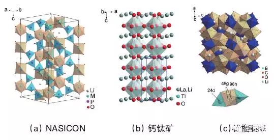 在氧化物中,鋰離子在尺寸大得多的O2-構(gòu)成的骨架結(jié)構(gòu)間隙進行傳導,減弱Li-O相互作用、實現(xiàn)鋰離子的三維傳輸及優(yōu)化傳輸通道中鋰離子與空位濃度的比例均有利于提高鋰離子的電導率?;谶@些理念,一些具有復雜結(jié)構(gòu)的氧化物鋰離子導體材料相繼出現(xiàn),其中具有代表性的包括石榴石型結(jié)構(gòu)體系、鈣鈦礦結(jié)構(gòu)體系、鈉快離子導體結(jié)構(gòu)體系。然而,這些材料中,只有石榴石型結(jié)構(gòu)體系的材料對金屬鋰穩(wěn)定。另兩種結(jié)構(gòu)體系中電導率較高的材料均含有可被金屬鋰還原的Ti、Ge等元素。此外,石榴石型結(jié)構(gòu)體系材料對空氣有較好的穩(wěn)定性,原料成本低,燒結(jié)體具有較高的機械強度,因此具備作為理想固態(tài)電解質(zhì)廣泛應用于全固態(tài)鋰電池的潛力。