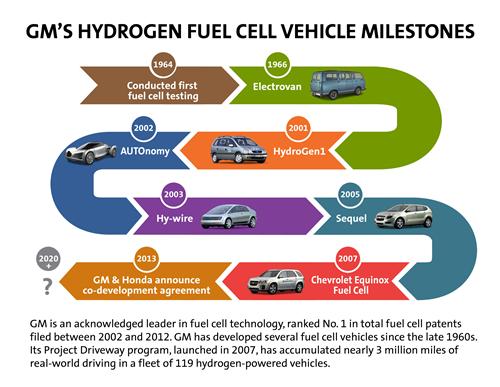 通用汽車的燃料電池源頭可追溯到1964年,當(dāng)時(shí)該公司第一次進(jìn)行燃料電池技術(shù)驗(yàn)證測(cè)試。1966年,通用推出第一款燃料電池車Electrovan。2001年,基于歐寶平臺(tái)的HydroGen1驗(yàn)證車問(wèn)世。2002年和2003年,Hy-wire和AUTOnomy燃料電池概念車的相繼推出成為通用在燃料電池技術(shù)方面新一輪沖擊的開端。Hy-wire采用的燃料電池功率94千瓦,短時(shí)峰值129千瓦,驅(qū)動(dòng)三相電動(dòng)馬達(dá),可推動(dòng)1,814千克重的車輛以160千米/時(shí)的速度行駛。 2005年,通用汽車以雪佛蘭Traverse為藍(lán)本打造了Sequel燃料電池車。該車燃料電池功率為73千瓦,搭配的鋰離子電池功率65千瓦。功率輸出65千瓦的電動(dòng)馬達(dá)驅(qū)動(dòng)前輪,制動(dòng)系統(tǒng)上的25千瓦輪內(nèi)馬達(dá)驅(qū)動(dòng)后輪,總功率輸出115千瓦。盡管Sequel是軸距3,040 mm、車長(zhǎng)4,994 mm的MPV,但仍然能夠在10秒內(nèi)從靜止加速至60英里/時(shí),續(xù)航里程480千米。Sequel將8千克氣態(tài)氫燃料存儲(chǔ)在三缸碳纖維燃料箱中,壓強(qiáng)達(dá)到700巴(10,000 p.s.i.)。