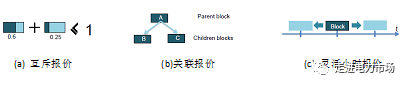 打包報(bào)價(jià):分為常規(guī)打包報(bào)價(jià)、配置打包報(bào)價(jià)、互斥報(bào)價(jià)、關(guān)聯(lián)報(bào)價(jià)、靈活小時(shí)報(bào)價(jià)幾類。常規(guī)打包報(bào)價(jià)是指將連續(xù)的幾個(gè)小時(shí)的電量打包到一起,要么全部成交,要么全部不成交,這稱為kill-or-fill原則。配置打包報(bào)價(jià)是指可以設(shè)置一個(gè)比例,只要出清的比例大于設(shè)置的閾值,就可以出清?;コ鈭?bào)價(jià)是指兩個(gè)配置打包報(bào)價(jià)的成交比例之和不能大于1,其中一個(gè)特例就是兩個(gè)打包報(bào)價(jià),一個(gè)全部成交,另一個(gè)全部不成交,因此叫做互斥報(bào)價(jià),如圖5(a)所示。關(guān)聯(lián)報(bào)價(jià)是指父報(bào)價(jià)和子報(bào)價(jià)之間具有關(guān)聯(lián)關(guān)系,當(dāng)父報(bào)價(jià)成交時(shí),子報(bào)價(jià)才成交,如圖5(b)所示。