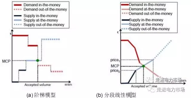 在形成供需曲線時(shí),階梯模型和分段線性模型都會(huì)用到,這是因?yàn)樵靖鹘灰姿捎玫哪P筒煌瑸榱吮苊饨o市場(chǎng)成員造成額外負(fù)擔(dān),在市場(chǎng)耦合后,這些模型都被保留下來。圖3所示為兩種模型的示意圖。