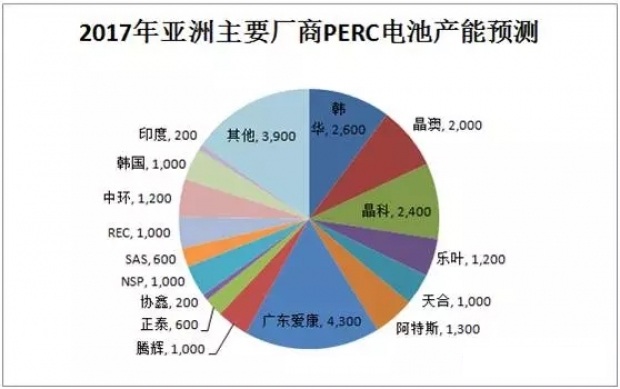 PERC技術(shù)在2014年開始成熟,2015-2016年迎來了產(chǎn)能的暴發(fā)增長期,一線廠商如晶科、晶澳、天合、阿特斯、協(xié)鑫、隆基樂葉、廣東愛康、韓華Q CELLS、REC等均在積極擴產(chǎn)。據(jù)亞化咨詢統(tǒng)計,2016年全球PERC電池產(chǎn)能已達(dá)15GW,2017年全球PERC電池產(chǎn)能將達(dá)30GW。隨著PERC產(chǎn)線設(shè)備的持續(xù)完善和國產(chǎn)化,以及適用于PERC工藝的導(dǎo)電漿料和金屬化技術(shù)的成熟,PERC電池產(chǎn)業(yè)化將迎來高峰期。