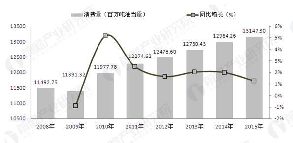 2008-2015年全球能源消費(fèi)總量及同比增速(單位:百萬(wàn)噸油當(dāng)量,%)