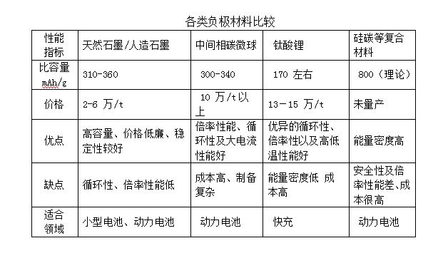 當(dāng)前主要使用的負(fù)極材料是天然石墨和人造石墨,其中天然石墨主要使用在 3C 領(lǐng)域,而人造石墨主要使用在動(dòng)力領(lǐng)域。傳統(tǒng)石墨材料的能量密度上限在 372 mAh/g,較當(dāng)前正極材料的能量密度還有相當(dāng)?shù)脑A俊J芪磥砟芰棵芏纫约皠?dòng)力電池高倍率放電的要求,盡管價(jià)格昂貴或技術(shù)尚不成熟,中間相碳微球(MCMB)、鈦酸鋰以及硅基負(fù)荷材料等高端負(fù)極材料逐漸進(jìn)入到了對性能要求較全面且較高的電池負(fù)極材料應(yīng)用中去。具體這幾種高端負(fù)極與天然石墨及人造石墨材料的特性以及優(yōu)缺點(diǎn)比較如下表所示。