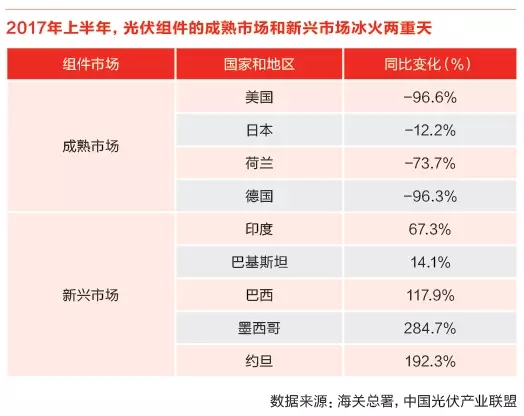 海外市場(chǎng):兩處明顯變化值得注意。一是從總體上來(lái)看,無(wú)論是硅片、電池片還是組件,中國(guó)企業(yè)的出口量都維持著高速增長(zhǎng),然而其出口額卻明顯同比下降,這說(shuō)明光伏組件的出口是在以量補(bǔ)價(jià),平均外銷(xiāo)價(jià)格要比去年低的多。二是從局部來(lái)看,國(guó)際市場(chǎng)結(jié)構(gòu)出現(xiàn)了明顯的變化,其中包括美國(guó)、德國(guó)、日本在內(nèi)的成熟市場(chǎng)出口額下滑明顯,而包括印度、巴西、墨西哥在內(nèi)的新興市場(chǎng)則出現(xiàn)了爆發(fā)式增長(zhǎng)。這主要是由于中國(guó)企業(yè)已經(jīng)有不少在成熟市場(chǎng)國(guó)家投資建廠,出貨量不再走海關(guān)統(tǒng)計(jì)口徑的原因。
