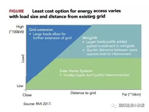 在全球尚未未通電的人口中有87%是農(nóng)村人口,其中相當(dāng)數(shù)量居住在遠(yuǎn)離電網(wǎng)的偏遠(yuǎn)地區(qū)。根據(jù)距離電網(wǎng)的距離和負(fù)荷的大小,解決10.6億人口通電大致有三種方案:如果需求負(fù)荷接近100千瓦、距離電網(wǎng)距離8公里范圍內(nèi),電網(wǎng)延伸是一個(gè)可以考慮的方案;如果負(fù)荷較大,但距離電網(wǎng)較遠(yuǎn),可考慮微電網(wǎng)(光伏+儲(chǔ)能+備用柴油發(fā)電);而那些地處偏遠(yuǎn)地區(qū)而負(fù)荷較低的村落,以戶用太陽能光伏供電為宜。