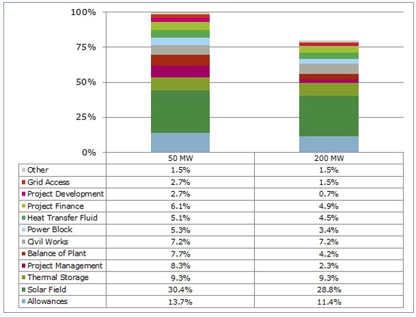 最理想的光熱電站的裝機(jī)規(guī)模大小需要在擴(kuò)大規(guī)模的最大收益點(diǎn)和缺點(diǎn)最小化之間找到平衡點(diǎn)。DOE對55MW和275MW兩種電站進(jìn)行的成本仿真分析對比結(jié)果顯示,槽式電站最合適的裝機(jī)規(guī)模為220MW,相對110MW的參照槽式電站模型來看,其LCOE可下降6%~8%;而塔式電站最合適的裝機(jī)規(guī)模為250MW,相對于100MW的塔式電站參照模型來看,其LCOE可下降20%。這是一個(gè)臨界點(diǎn),如果繼續(xù)增加裝機(jī)規(guī)模,其LCOE不降反升。