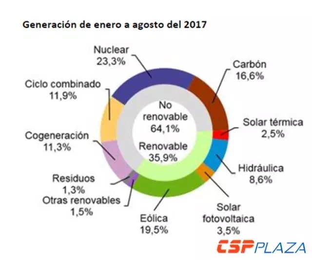 截止目前,2017年西班牙光熱發(fā)電量占總發(fā)電量的2.5%,而核電、風(fēng)電、煤電、聯(lián)合循環(huán)發(fā)電量分別占總發(fā)電量的23.3%、19.5%、16.6%與11.9%;熱電聯(lián)產(chǎn)、水電、光伏發(fā)電量則分別占總發(fā)電量的11.3%、8.6%與3.5%。(見(jiàn)下圖)