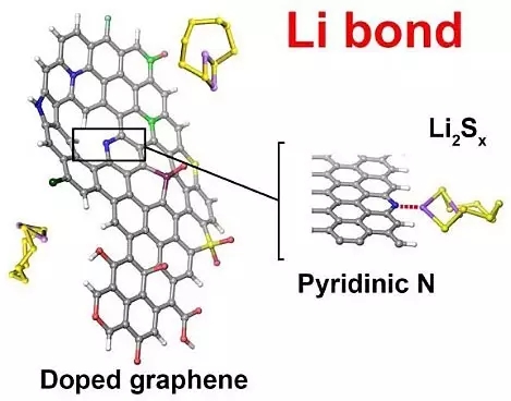 研究人員首先采用量子化學的計算方法對含有吡啶的石墨烯模型分子中氮原子與多硫化物之間的相互作用進行了理論分析。計算表明,吡啶的氮位點與多硫化物的鋰離子之間存在較強的偶極-偶極相互作用,形成所謂的“鋰鍵”。而石墨烯上共軛π電子的給電子效應可以進一步增強這種相互作用。石墨烯進行氮摻雜后結(jié)合能增強的原因主要是吡啶氮原子的引入使碳材料表面極化產(chǎn)生偶極,與極性的多硫化物形成偶極-偶極靜電相互作用,從而形成類似氫鍵作用的“鋰鍵”。