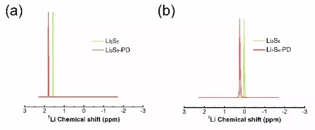 作者進一步對含有吡啶氮的石墨烯模型分子作用前后的7Li NMR進行了理論預測和實驗測量。結(jié)果顯示,在與吡啶氮結(jié)合后,7Li的NMR峰化學位移向低場移動了0.3 ppm,計算值和實驗值很好地吻合。這一結(jié)果充分說明鋰離子周圍的化學環(huán)境發(fā)生變化,證明了“鋰鍵”的形成,鋰硫電池正極界面的相互作用因此得到很好的定量化描述。