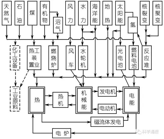 20世紀80年代初, 在對能源利用的核心科學問題進行全面深入地綜合與總結(jié)后, 吳仲華提出了基于熱能品位概念的“溫度對口、梯級利用”理念, 作為普遍適用的熱能利用原理, 對能源動力的發(fā)展應(yīng)用具有重要的意義。他通過圖1來表示各種能源經(jīng)過各種設(shè)備轉(zhuǎn)化為各種不同形式的能來使用的情況。他認為在開發(fā)利用能源時, 要認真比較各種能源的優(yōu)缺點, 對各種能源的品質(zhì)很好地加以綜合考慮; 現(xiàn)代科學技術(shù)的發(fā)展將為較大幅度地提高能源利用率提供可能性和多樣性, 但都必須重視基于能的品位概念的梯級利用理念。