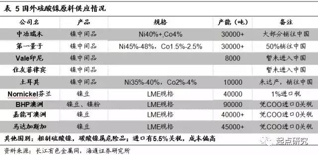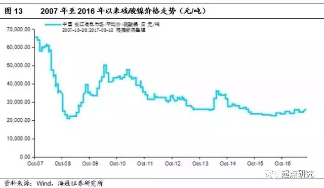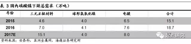 據(jù)安泰科估計,2017年國內(nèi)硫酸鎳產(chǎn)量將上升至30萬噸;國外方面產(chǎn)量約為20萬噸,除了住友集團、優(yōu)美科和俄鎳,還有幾家企業(yè)在產(chǎn)。我們根據(jù)此后的擴產(chǎn)情況推測,2018年全球硫酸鎳將進一步上升至60萬噸左右。