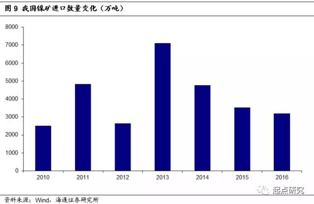 對于國內(nèi)的硫酸鎳企業(yè)來說,事情又不一樣。由于鎳中間品主要由紅土鎳礦通過氫氧化物沉淀的技術(shù)制備,而紅土鎳礦大都依賴進口,近年來鎳價低迷逼停了很多國外的中小型鎳礦山,我國鎳礦進口數(shù)量自2013年以來連年下滑,因此國內(nèi)的硫酸鎳企業(yè)反映的是原料不足。國內(nèi)目前只有金川集團擁有自產(chǎn)硫化礦,格林美擁有鎳回收生產(chǎn)線,對進口的需求不大。