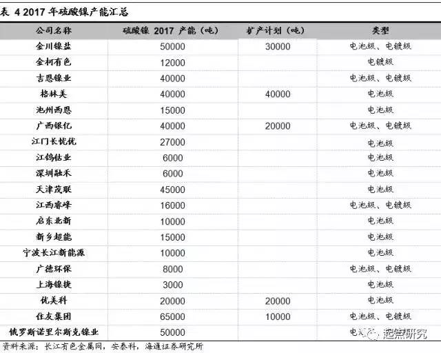 目前國內(nèi)的硫酸鎳產(chǎn)能大致為34.3萬噸左右,由于動力電池和新能源汽車的火熱,金川鎳鹽、格林美和廣西銀億此后還有9萬噸的硫酸鎳擴產(chǎn)計劃。