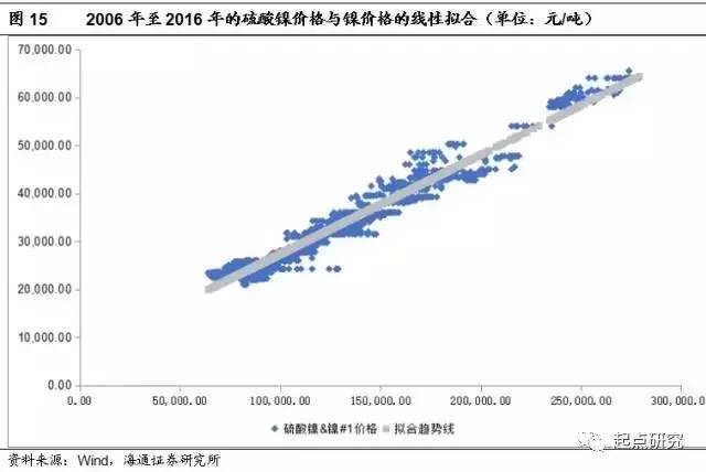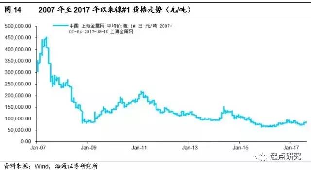 從硫酸鎳價格和鎳價格的線性擬合圖,我們發(fā)現(xiàn)兩者呈現(xiàn)高度相關(guān)性;通過回歸性測試發(fā)現(xiàn),兩個的價格相關(guān)性達到0.98。因此我們可以通過對未來硫酸鎳價格的推斷來反向驗證我們對鎳價格的預(yù)期。受益于三元材料拉動硫酸鎳價格緩慢升至目前的25500萬元/噸,同時可以觀察到硫酸鎳同電解鎳的價差進一步拉大(一頓硫酸鎳需要0.22噸電解鎳),由年初的3000~4000元/噸提升至目前的7000~8000元/噸,綜合來看目前鎳價處于歷史低位。