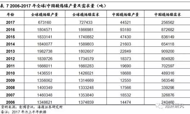 從2006至2017年的精煉鎳的供需平衡中,在2007-2015的這個時間段,全球精煉鎳始終存在供大于求的現(xiàn)象,導(dǎo)致了鎳價格的長期性下跌,現(xiàn)在鎳依然處于一個長期性的價格低位。在2016年以及2017年的上半年,供需平衡發(fā)生了反轉(zhuǎn),2017年上半年,全球精煉鎳的缺口已達50000噸,鎳價格得到支撐。而中國對鎳產(chǎn)品很大程度上依賴進口,國內(nèi)產(chǎn)量遠低于需求量,國內(nèi)鎳價格很大程度上取決于國際鎳價。