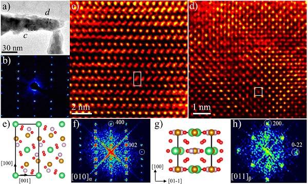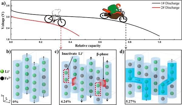 通過和布魯克海文國家實驗室、德國于利希國家實驗室、美國阿貢國家實驗室等合作,課題組對兩種材料的結構進行了深入分析,用高精度球差電子顯微鏡首次發(fā)現磷酸鐵錳鋰的第二相β-LiMn1-xFexPO4以量子點(2納米左右)嵌在α-LiMn1-xFexPO4 50納米顆粒中。研究發(fā)現性能好的材料其鐵鋰反位量高,產生了許多的缺陷位置,因為這些缺陷點打通了相鄰的其他方向的傳輸,使得鋰離子的傳輸從一維鋰離子通道傳輸擴展成為三維通道傳輸,從而提高了該鋰電池材料的充放電性能。如果α-LiMn1-xFexPO4材料存在第二相β-LiMn1-xFexPO4以量子點嵌入形成套嵌結構的納米材料后,嵌入量子點將堵塞部分鋰離子的三維通道傳輸,從而降低了鋰離子在整個晶體的傳輸效率,影響了該鋰電池材料的充放性能。