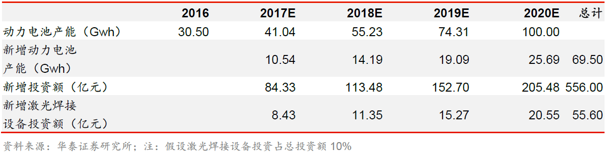 十三五規(guī)劃期間顯示動力電池投資額將達(dá)到560億元,對應(yīng)激光設(shè)備需求56億元。假設(shè)國家將在2020年達(dá)到《促進(jìn)汽車動力電池產(chǎn)業(yè)發(fā)展行動方案》中目標(biāo),那么在2017年到2020年間,國內(nèi)動力電池新增產(chǎn)能約為70Gwh。根據(jù)部分動力電池項目的投資情況不完全統(tǒng)計,每Gwh新增產(chǎn)能對應(yīng)的投資額約為8億元,而激光焊接設(shè)備在動力電池廠投入中占比5至15%,則到2020 年國內(nèi)動力電池廠新增設(shè)備需求約為28至84 億元。