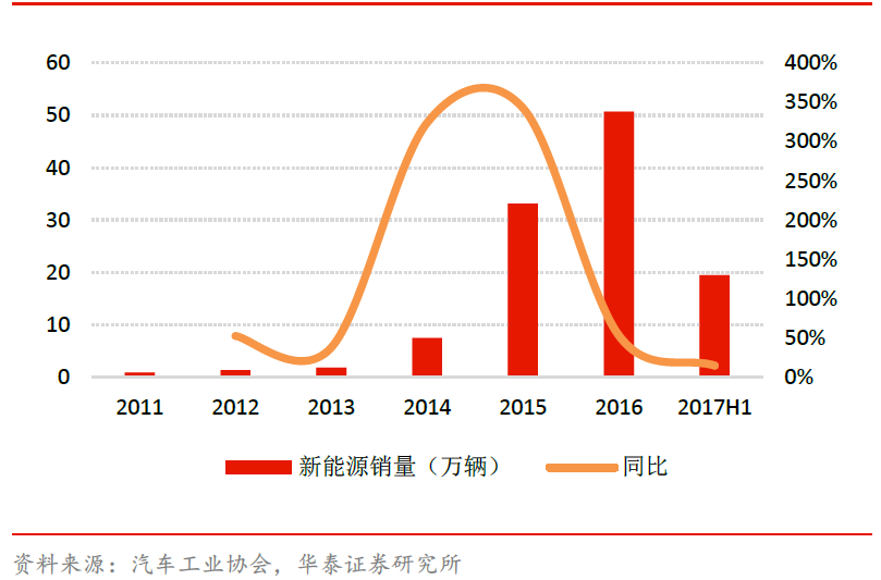 新能源汽車需求持續(xù)增長,推動動力電池行業(yè)擴(kuò)張。受新能源汽車補(bǔ)貼減少影響,2017年上半年國內(nèi)新能源汽車銷量為19.5 萬輛,同比僅增長14.71%,預(yù)計全年可完成銷量約70萬輛。但2016年10月底工信部發(fā)布的《節(jié)能與新能源汽車技術(shù)路線圖》提出,至2020年新能源汽車銷量占汽車總體銷量的比例達(dá)到7%以上;至2025 年新能源汽車銷量占汽車總體銷量的比例達(dá)到20%以上;至2030 年新能源汽車銷量占汽車總體銷量的比例達(dá)到40%以上。汽車電動化的大趨勢較為確定,動力電池增長確定。