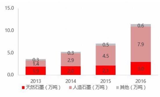 據(jù)前瞻產(chǎn)業(yè)研究院了解到,現(xiàn)在市場(chǎng)上的負(fù)極大部分被天然石墨壟斷,但是受制于上游價(jià)格,本人認(rèn)為,在性價(jià)比相同的情況下,人造石墨將有可能替代天然石墨。根據(jù)了解,人造石墨在市場(chǎng)中的份額不斷攀升,從2013年的1.4萬(wàn)噸到2016年的7.9萬(wàn)噸,增長(zhǎng)率為464.28%。而相比之下,天然石墨的增長(zhǎng)趨勢(shì)就不是很明顯,從2013年1.9萬(wàn)噸到2016年的3.0萬(wàn)噸,增長(zhǎng)率僅為57.89%。