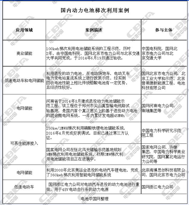 國家對于梯次利用是非常支持的。早在《節(jié)能與新能源汽車產(chǎn)業(yè)發(fā)展規(guī)劃(2011~2020年)》中就明確提出:“要制定動力電池回收利用管理辦法,建立動力電池梯級利用和回收管理體系,明確各相關(guān)方的責任、權(quán)利和義務?!痹趪业墓膭钕拢陙順I(yè)內(nèi)人士對動力電池梯次利用展開了積極的探索,建立了部分示范工程。如下: