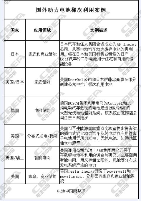 相對于國外,我國的動力電池梯次利用起步較晚。近期法國雷諾汽車將廢舊的動力電池做成充電樁的報道引起廣泛關(guān)注。除此之外,國外也有很多例子為國內(nèi)的梯次利用提供了參考,如下: