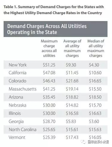 美國電價包含基本電價(demand charge,按照需求負荷固定計費)和電度電價(meter charge,按照耗電量計費,按照高峰、低谷分時電價),基本電費可能占到整個電費賬單的30%-70%。美國各州的基本電價區(qū)別很大,即便在一個州內(nèi)也會有差別。例如在紐約州,最高的基本電費達到51.25美元,而不同售電公司最高基本電價的均值為9.30美元。如果用電戶安裝了電池儲能設(shè)備,那么就可以通過低谷時段低價儲存電能在高峰時使用,不僅省了電度電價,而且降低需求負荷,也就可以降低需要付的基本電費。