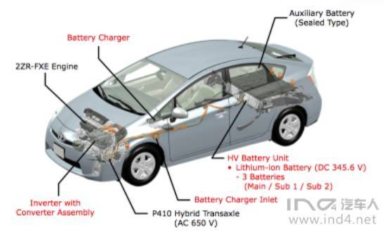 Prius Prime版本還采用了鋰電池實(shí)現(xiàn)了Plugin功能,由288個(gè)Cells(32cells*3stacks*3packs)組成345.6V的電池系統(tǒng):