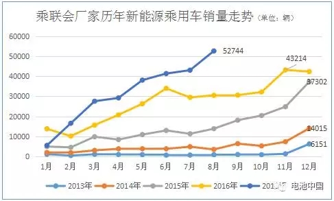 據(jù)全國(guó)乘聯(lián)會(huì)統(tǒng)計(jì),2017年8月,乘聯(lián)會(huì)廠家的新能源乘用車銷量為5.3萬(wàn)輛,同比銷量增加2.2萬(wàn)輛,環(huán)比銷量增加近1萬(wàn)輛。電池中國(guó)網(wǎng)對(duì)比發(fā)現(xiàn),在乘聯(lián)會(huì)統(tǒng)計(jì)的2013—2017年的銷量數(shù)據(jù)中,今年8月份新能源乘用車的銷量創(chuàng)造了歷史新高,這一方面說(shuō)明新能源乘用車市場(chǎng)在逐步擴(kuò)張,另一方面也說(shuō)明了新能源汽車對(duì)傳統(tǒng)燃油汽車的取代開(kāi)始加速。8月取得如此優(yōu)異的成績(jī),主要得益于推薦目錄的定期公布以及7月份購(gòu)置稅目錄的公布。