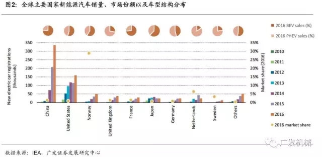 2016年全球新能源汽車銷量創(chuàng)歷史高點,總計超過75萬輛。其中,中國市場的增長尤為明顯,新增數(shù)量高達33.6萬輛,約為同期美國新能源汽車新增保有量的2倍。歐洲市場新能源汽車2016年新增保有量約為21.5萬輛,新能源汽車的發(fā)展還是集中在以下部分國家,主要包括挪威、英國、法國、德國、荷蘭及瑞典。挪威對新能源汽車的發(fā)展在政策上給予了大力支持,新能源汽車的稅收、道路通行費等都有較大程度的減免,使得挪威成為2016年新增汽車數(shù)量中新能源汽車占比最大的國家,占比高達29%。此外,中國和法國的新能源汽車市場中,純電動汽車的占比極大,約為75%。而荷蘭、瑞典及英國以發(fā)展插電式混合動力汽車為主。
