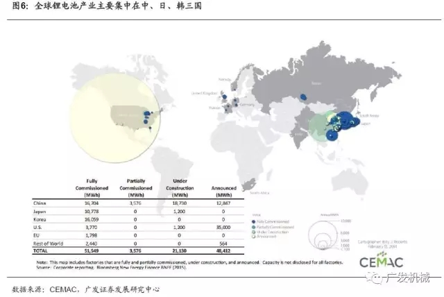 目前全球鋰電池的主要生產(chǎn)國為中國、日本及韓國。憑借產(chǎn)業(yè)優(yōu)勢和技術(shù)積累,松下、LG化學(xué)、三星SDI目前仍是鋰電池領(lǐng)域三大巨頭。根據(jù)BloombergNewEnergyFinace統(tǒng)計,2017年一季度全球動力電池出貨量5273MWh,其中三巨頭總計占比達62%。松下采用高鎳三元路線,封裝以圓柱形為主,其圓柱形電池能量密度世界領(lǐng)先,與特斯拉保持良好的合作關(guān)系,是動力電池行業(yè)的領(lǐng)導(dǎo)者;LG化學(xué)起步稍晚,電池正極主要是三元NCM,是海內(nèi)外公認(rèn)的軟包龍頭,擁有眾多優(yōu)質(zhì)客戶,包括現(xiàn)代、通用、雷諾、日產(chǎn)等,是動力電池行業(yè)的后起之秀;三星長期立足消費類鋰電的研發(fā)生產(chǎn),技術(shù)積累深厚,發(fā)展大容量方形硬殼電池為主。近年來國內(nèi)CATL、比亞迪、國軒等企業(yè)也相繼完成了各自技術(shù)路線的初步探索,在產(chǎn)能規(guī)模上成為日韓動力電池巨頭有力的挑戰(zhàn)者。