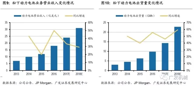 松下電器產(chǎn)業(yè)株式會社創(chuàng)建于1918年,于1994年開始研發(fā)可充電鋰離子電池。1998年松下開始量產(chǎn)筆記本電腦專用的圓柱形鋰離子電池,并建成了業(yè)內(nèi)領(lǐng)先的鋰離子電池生產(chǎn)線。2008年11月,松下宣布與三洋電機合并,一躍成為全球最大的鋰電池供應(yīng)商。隨著新能源汽車的興起,松下動力電池業(yè)務(wù)營業(yè)收入快速增長,2016年達18億美元,同比增速約為50%,2016年動力電池出貨量約為9.8GWh,同比增速56%。