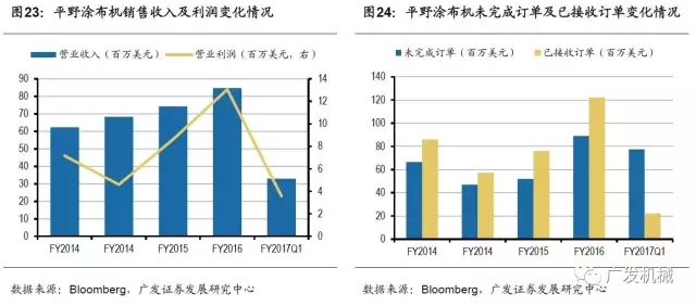 近年來,受益動力電池行業(yè)景氣度高漲,平野涂布機業(yè)務(wù)營業(yè)收入逐年攀升,F(xiàn)Y2017年涂布機營業(yè)收入8470萬美元,同比增長14%,營業(yè)利潤1306萬美元,同比增長51.4%。此外,動力電池企業(yè)持續(xù)擴產(chǎn),平野涂布機在手訂單充裕。