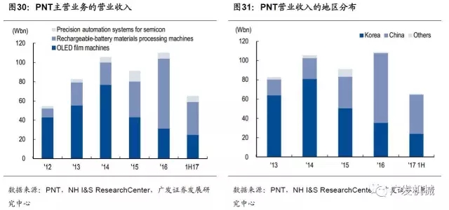 韓國以及全球新能源汽車的發(fā)展帶動了韓國三星SDI、LG化學(xué)等動力電池企業(yè)的繁榮,作為三星SDI、LG化學(xué)等優(yōu)質(zhì)動力電池企業(yè)鋰電設(shè)備的供貨商,PNT鋰電設(shè)備業(yè)務(wù)營業(yè)收入快速增長。從PNT營業(yè)收入的地區(qū)分布來看,中國市場對業(yè)績的貢獻逐年增大,并在2016年首次超過韓國本土。受益新能源汽車中國市場的發(fā)展,2017年上半年,PNT中國市場的營收占比進一步擴大,達到了61.9%,