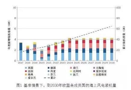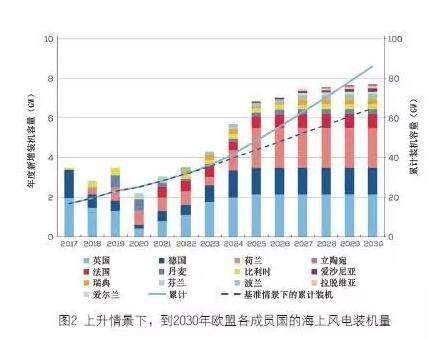 在基準情景下,到2030 年,歐洲地區(qū)海上風電累計裝機容量為6400萬千瓦,年均增長450 萬千瓦。每年可以發(fā)電2500 億千瓦時,將占到歐盟總電力需求(預計在3.2 萬億千瓦時左右)的8%。而在上升情景中,累計裝機容量將達到8600 萬千瓦,比前者增加了1/3,年均增長750 萬千瓦。每年發(fā)電3400 億千瓦時,可以滿足歐盟地區(qū)11% 的電力需求。