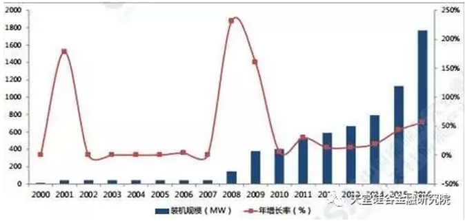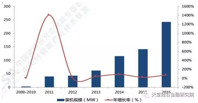 圖2:全球電化學(xué)儲能累計裝機規(guī)模(2000–2016)