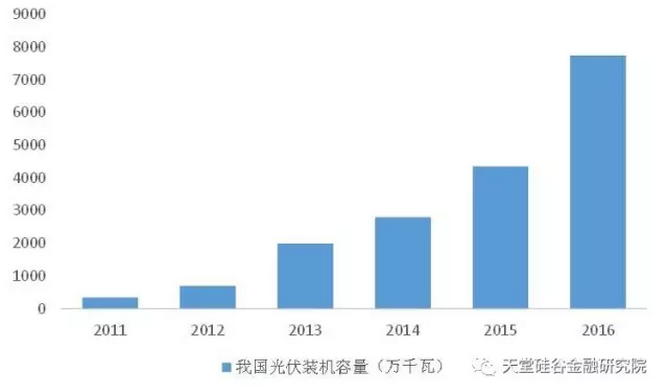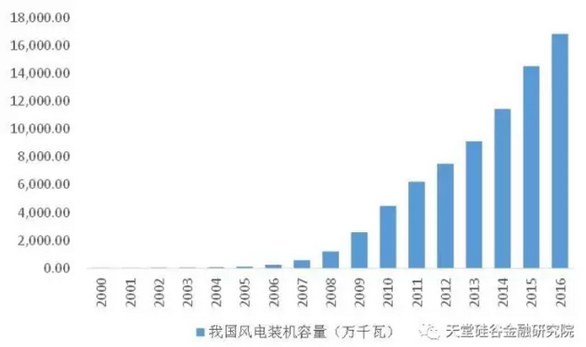 儲能的第三個應(yīng)用是在新能源發(fā)電領(lǐng)域,我國新能源電力主要是指光伏與風(fēng)電。在2000年之后,光伏以及風(fēng)電都經(jīng)歷一輪行業(yè)爆發(fā)性增長,截止2016年,光伏、風(fēng)電累計裝機容量分別為7742萬千瓦(圖6)與1.69億千瓦(圖7)。