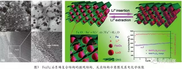 綜上,我們在石墨烯復合電化學儲能材料方面開展了較為系統(tǒng)的研究,得到了國內外同行的廣泛關注,相關論文已被引用超過3 100次,并應邀撰寫綜述論文3篇。特別是較早地開展了Co3O4和Fe3O4與石墨烯復合作為高性能電極材料的研究,并且給出了相應的結構模型(如圖3 所示),提出了石墨烯與氧化物復合是石墨烯在儲能器件中應用的一個重要發(fā)展方向,因此獲得了廣泛關注,這兩篇論文已被引用1 200余次。
