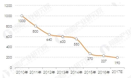 2010-2017年電動汽車電池成本情況及預(yù)測(單位:美元/KWH)